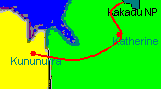 Unser erstes Ziel ist der Kakadu National Park. Da eine Brücke auf dem Arnhem Highway eingestürzt ist, empfiehlt unser Autovermieter eine 4WD-Strecke. Das erste Mal Off-Road ist unproblematischer als befürchtet. Das heißt, Befürchtungen hat eher die einheimische Polizei, die am Pistenbeginn und nach ein paar Kilometern noch einmal steht und den unbedarften Touristen Hinweise zum Befahren einer nicht befestigten Straße gibt.